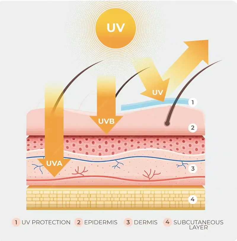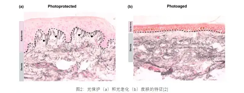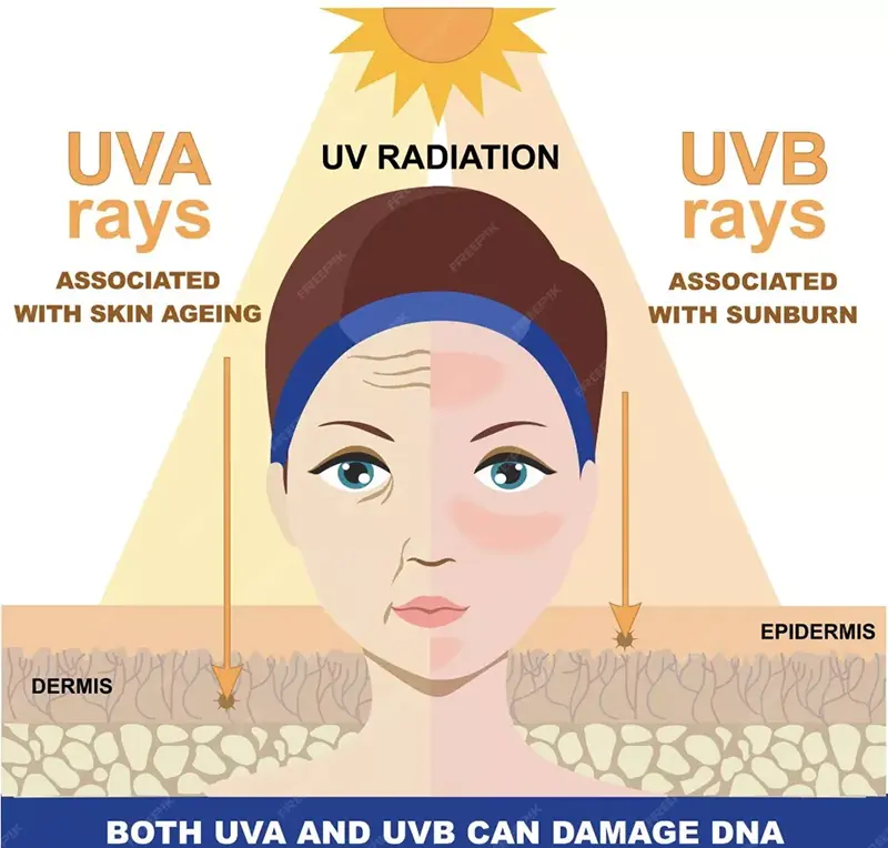 UVA এবং UVB উভয়ই ত্বকের ক্ষতির কারণ হতে পারে, তবে তাদের প্রভাবগুলি মূলত তাদের অনুপ্রবেশ গভীরতার কারণে আলাদা। স্পষ্টতই সমৃদ্ধ UVA ডার্মিসের গভীরে প্রবেশ করতে পারে এবং এটি ফটোগ্রাফির সাথে আরও সরাসরি সম্পর্কিত, কারণ তারা ROS তৈরি করবে এবং কোলাজেন এবং ইলাস্টিনকে হ্রাস করবে, যা বলিরেখা, ত্বকের স্থিতিস্থাপকতা হ্রাস এবং অকাল বার্ধক্যের অন্যান্য লক্ষণগুলির দিকে পরিচালিত করবে। বিপরীতে, UVB প্রধানত এপিডার্মিসকে প্রভাবিত করে, যার ফলে স্বল্প মেয়াদে রোদে পোড়া (সৌর এরিথেমা) এবং মেলানিন উৎপাদন হয়, যখন দীর্ঘমেয়াদী এক্সপোজার হাইপারকেরাটোসিস হতে পারে এবং ত্বকের ম্যালিগন্যান্ট টিউমারের ঝুঁকি উল্লেখযোগ্যভাবে বাড়িয়ে দেয়।