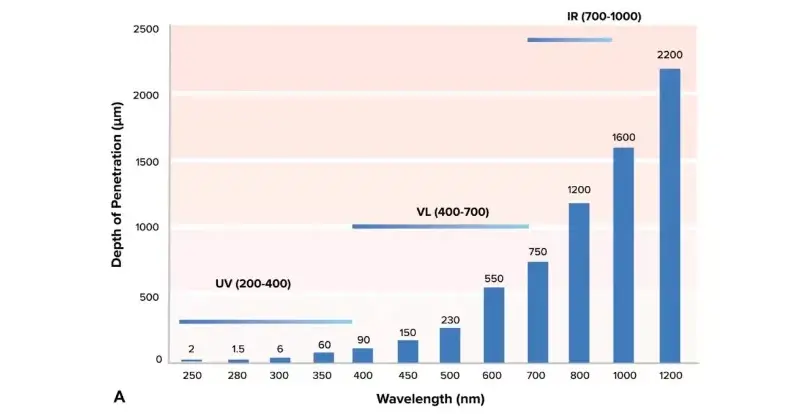 উপরের চিত্রে দেখানো হয়েছে, দৃশ্যমান আলোর ত্বকের উপর একটি বড় প্রভাব রয়েছে, কারণ এই ব্যান্ডটির ত্বকে গভীর অনুপ্রবেশের গভীরতা রয়েছে। লাল আলো এপিডার্মিস এবং ডার্মিস ভেদ করতে পারে এবং চর্বি স্তরে পৌঁছাতে পারে, যা তরঙ্গদৈর্ঘ্য এবং অনুপ্রবেশ গভীরতার মধ্যে সম্পর্ক এবং তরঙ্গদৈর্ঘ্য এবং শক্তির মধ্যে বিপরীত সম্পর্ক নির্দেশ করে, যখন নীল আলোতে লাল আলোর চেয়ে বেশি শক্তি এবং কম অনুপ্রবেশ গভীরতা রয়েছে।