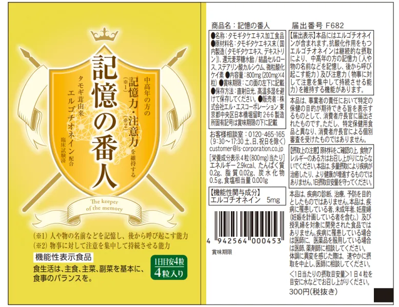 জাপানের এলএস কর্পোরেশন দ্বারা চালু করা ergothioneine সম্পূরকটি মধ্যবয়সী এবং বয়স্ক ব্যক্তিদের স্মৃতিশক্তি হ্রাসের জন্য ডিজাইন করা একটি পণ্য।