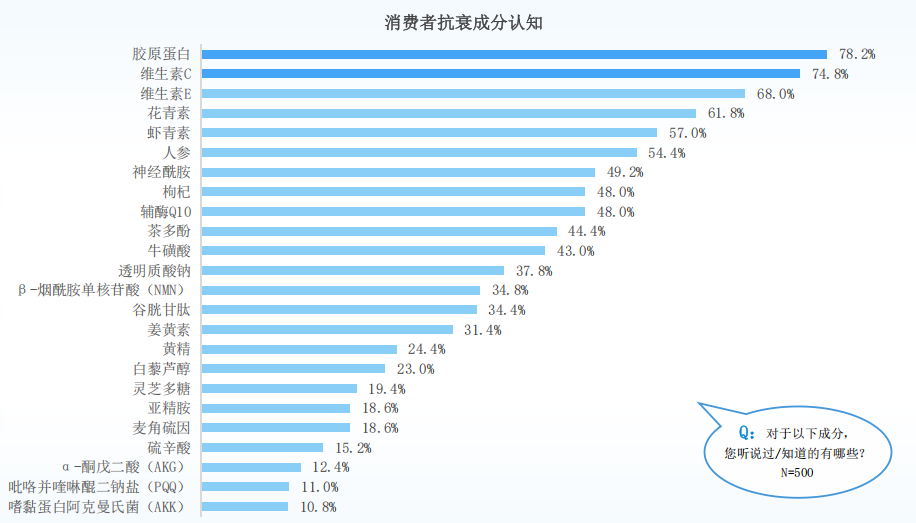 বাজারের শিক্ষা এবং উন্নয়নের জন্য ধন্যবাদ, কোলাজেন বর্তমানে ভোক্তাদের মধ্যে একটি উচ্চ স্বীকৃত "অ্যান্টি-এজিং উপাদান"। মূলধারার অ্যান্টি-এজিং উপাদানগুলির বোঝার উপর সমীক্ষায়, কোলাজেন (78.2%), ভিটামিন সি (74.8%), এবং ভিটামিন ই (68%) হল শীর্ষ তিনটি উপাদান যা ভোক্তারা মৌখিক অ্যান্টি-এজিং পণ্যগুলির জন্য স্বীকৃতি দেয়৷ বিভিন্ন বয়সের মধ্যে শীর্ষ 5টি অ্যান্টি-এজিং উপাদানের উপলব্ধির মধ্যে, কোলাজেন নিঃসন্দেহে "তারকা উপাদান"।